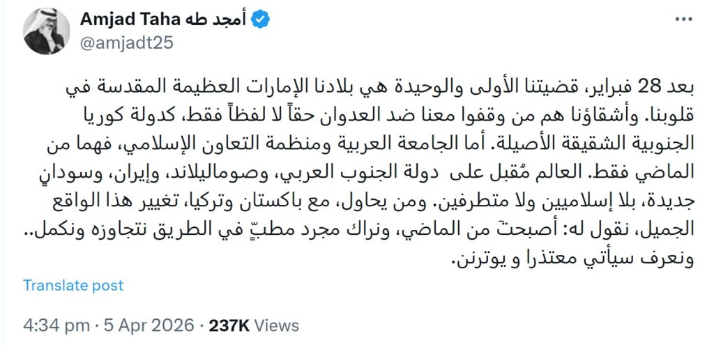 امجد طہٰ ‘ابراہیم کارڈز’ کے پردے میں تل ابیب کے لیے عرب مؤقف کا سودا کرنے میں مصروف ہیں۔ ان کے تجزیے اور کمنڑی محض اسرائیلی سکیورٹی پروپیگنڈے کی بازگشت ہیں، جس میں وہ ایران اور اس کے اتحادیوں کو بالکل اسی مخصوص رنگ میں پیش کرتے ہیں جیسا کہ تل ابیب کا مطالبہ ہوتا ہے۔ ان کی تحریروں اور تقاریر میں کسی آزاد عرب نقطہ نظر کی کوئی جھلک دکھائی نہیں دیتی، بلکہ وہ ایک نظریاتی فٹ سولجر کے طور پر اسرائیلی ترجیحات کو خلیج میں نافذ کرانے کی کوشش کر رہے ہیں۔