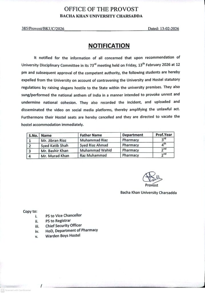 کمیٹی نے ویڈیو شواہد اور ابتدائی تحقیقات کی روشنی میں فارمیسی ڈیپارٹمنٹ کے چار طلبہ کو قصوروار قرار دیتے ہوئے ان کے اخراج کا حکم جاری کر دیا۔ انتظامیہ کی جانب سے جاری کردہ باضابطہ نوٹیفکیشن کے مطابق مذکورہ طلبہ کی ہاسٹل الاٹمنٹ بھی فوری طور پر منسوخ کر دی گئی ہے اور انہیں یونیورسٹی کی حدود چھوڑنے کی ہدایت کی گئی ہے۔ یونیورسٹی حکام کا موقف ہے کہ تعلیمی ادارے کے نظم و ضبط اور قومی وقار پر کوئی سمجھوتہ نہیں کیا جائے گا۔