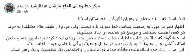 مارشل عبدالرشید دوستم کا کہنا ہے کہ اگرچہ ڈیورنڈ لائن کی قانونی حیثیت کو تسلیم کرنے کے حوالے سے مباحثے پہلے بھی ہوتے رہے ہیں، لیکن استاد محقق جیسے بااثر اور قد آور رہنماء کا اس معاملے پر جرات مندانہ اور واضح لہجہ ان کی گہری سیاسی و سماجی بصیرت کا منہ بولتا ثبوت ہے۔