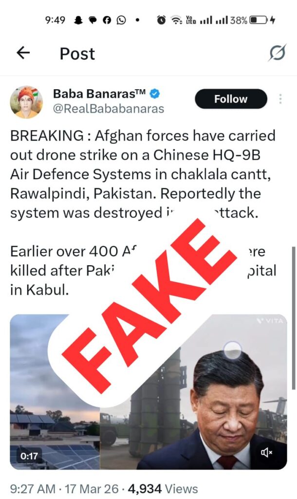 سوشل میڈیا پر جنگی جنون میں مبتلا ایک بھارتی صارف کی جانب سے راولپنڈی کے حساس عسکری علاقے میں افغان ڈرون حملے اور چینی ساختہ ایئر ڈیفنس سسٹم کی تباہی کا مضحکہ خیز دعویٰ سامنے آیا ہے، جو حقیقت سے مکمل طور پر عاری ہے۔ اور یہ خبر “باب بنارس” نامی بھارتی اکاؤنٹ سے نشر کی گئی ہے۔۔