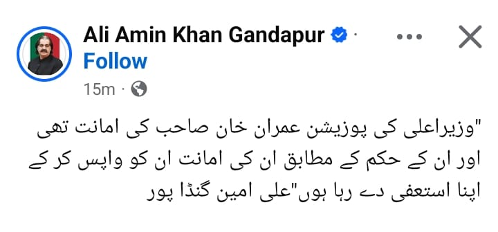 وزیراعلیٰ خیبر پختونخوا علی امین گنڈاپور نے صوبے کی وزارت اعلیٰ سے مستعفی ہونے کا اعلان کردیا۔