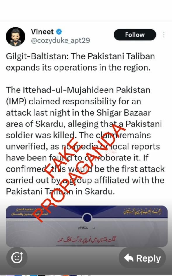 تحقیقات کے مطابق دشمن قوتوں اور ریاست مخالف عناصر کی جانب سے ‘اتحاد المجاہدین پاکستان’ کے نام سے ایک جعلی پوسٹر وائرل کیا جا رہا ہے، جس میں پاک فوج پر حملے کے جھوٹے دعوے کیے گئے ہیں۔ یہ دشمن انٹیلی جنس ایجنسیوں کا ایک آزمودہ حربہ ہے تاکہ سوشل میڈیا کے ذریعے افواہیں پھیلا کر امن و امان کی صورتحال کو خراب کیا جا سکے۔