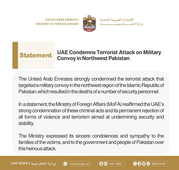 وزارتِ خارجہ متحدہ عرب امارات نے فوجی قافلے پر حملے کی سخت مذمت کرتے ہوئے اسے “دہشت گردانہ فعل قرار دیا جو ملک کی سلامتی اور استحکام کو نقصان پہنچانے کے لیے کیا گیا۔”