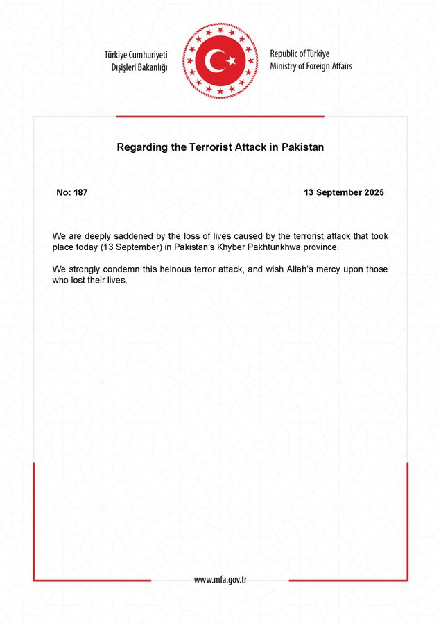 انقرہ نے خیبر پختونخوا میں قیمتی جانوں کے ضیاع پر گہرے رنج و غم کا اظہار کرتے ہوئے اس واقعے کو “دہشت گردی اور بزدلانہ حملہ” قرار دیا۔