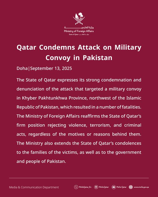 دوحہ نے خیبر پختونخوا میں فوجی قافلے پر ہونے والے حملے کی سخت مذمت اور مخالفت کرتے ہوئے اس واقعے کو دہشت گردی اور مجرمانہ اقدام قرار دیا اور اس بات کا اعادہ کیا کہ قطر ہر قسم کی دہشت گردی اور کارروائیوں کی مخالفت کرتا ہے چاہے ان کے پسِ پردہ کچھ بھی ہو۔