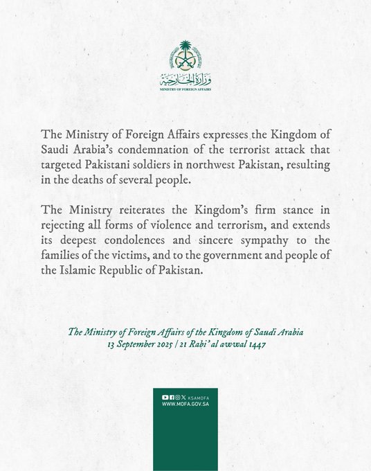 پاکستان کے شمالی مغربی علاقے میں فوجیوں کو نشانہ بنانے والے دہشت گرد حملے کی سعودی عرب بھرپور مذمت کرتا ہے۔