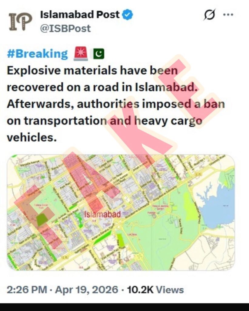 وفاقی دارالحکومت اسلام آباد کی سکیورٹی صورتحال کے حوالے سے افغان پراپیگنڈا سوشل میڈیا اکاؤنٹ ‘اسلام آباد پوسٹ’ کی جانب سے ایک بار پھر من گھڑت اور گمراہ کن مہم جوئی کی گئی ہے۔ مذکورہ اکاؤنٹ نے سوشل میڈیا پر یہ بے بنیاد دعویٰ کیا ہے کہ اسلام آباد کی ایک مصروف شاہراہ سے بارودی مواد برآمد ہوا ہے، جس کے بعد انتظامیہ نے فوری کاروائی کرتے ہوئے ہر قسم کی نقل و حمل اور بالخصوص بھاری مال بردار گاڑیوں کے داخلے پر سخت پابندی عائد کر دی ہے۔