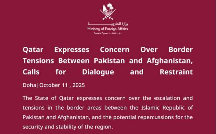 تفصیلات کے مطابق قطر کی وزارتِ خارجہ کی جانب سے جاری ہونے والے بیان میں پاکستان اور افغانستان کے درمیان سرحدی علاقوں میں بڑھتی ہوئی کشیدگی اور تناؤ پر تشویش کا اظہار کیا ہے اور اس کے خطے کی سلامتی و استحکام پر ممکنہ اثرات کے حوالے سے بھی خدشات کا اظہار کیا ہے۔