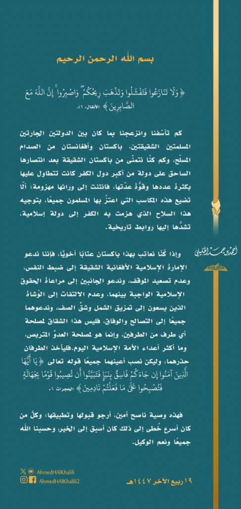 مفتی اعظم عمان احمد بن حمد الخلیلی نے افغانستان کو پاکستانی فورسز کے خلاف اشتعال انگیزی روکنے کی درخواست کر دی۔