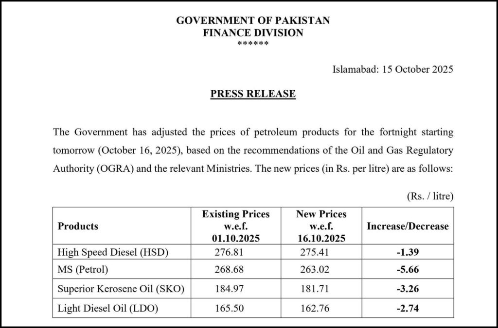 اسلام آباد حکومت پاکستان نے مہنگائی سے ریلیف دینے کے لیے پٹرولیم مصنوعات کی قیمتوں میں نمایاں کمی کا اعلان کر دیا۔ وزیراعظم شہباز شریف کی ہدایت پر وزارت خزانہ نے نئی قیمتوں کا نوٹیفکیشن جاری کر دیا ہے۔