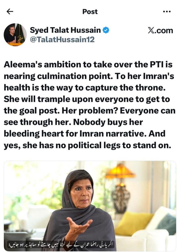 پاکستان تحریک انصاف کے اندرونی حلقوں میں ان دنوں ایک نیا ہیجان برپا ہے، جس کا مرکز عمران خان کی ہمشیرہ علیمہ خان کے مبینہ سیاسی عزائم ہیں۔ معروف صحافی سید طلعت حسین اور دیگر سیاسی مبصرین کے مطابق علیمہ خان کی پارٹی کنٹرول سنبھالنے کی خواہش اب واضح طور پر نمایاں ہو رہی ہے، جس نے تحریک انصاف میں جماعتی سطح پر ایک نئی بحث چھیڑ دی ہے۔