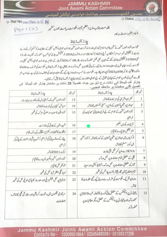 عوامی ایکشن کمیٹی نے وزیراعظم آزاد کشمیر کے فوری استعفے کا بھی مطالبہ کیا ہے اور کہا ہے کہ اس وقت موجودہ قیادت عوام کے اعتماد پر پوری نہیں اتر رہی۔ ساتھ ہی مظفرآباد کے سیکٹر کمانڈر کی معطلی اور ان کے خلاف تحقیقات کے آغاز کا بھی مطالبہ کیا گیا ہے۔ ایک اور نکتہ جو کمیٹی نے اٹھایا وہ یہ تھا کہ ایف آئی اے کی ایگزٹ کنٹرول لسٹ اور اسٹاپ لسٹ سے عوامی ایکشن کمیٹی کے رہنماؤں، اوورسیز کشمیریوں اور صحافیوں کے نام نکالے جائیں تاکہ انہیں آزادانہ نقل و حرکت کی اجازت مل سکے۔