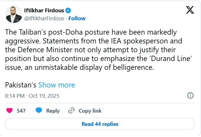 دوحہ مذاکرات کے بعد قطر کے وزارتِ خارجہ نے ابتدا میں ایک بیان جاری کیا جس میں امید ظاہر کی گئی کہ جنگ بندی “دو بھائی ملکوں کی سرحد پر تناؤ کو کم کرے گی”۔ تقریباً 18 گھنٹے بعد بیان سے سرحد کا ذکر حذف کر دیا گیا۔