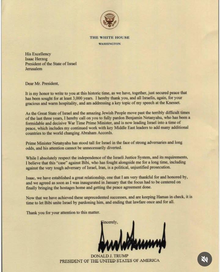 امریکی صدر ٹرمپ نےخط لکھتے ہوئے کہا ہے کہ اب وقت آ گیا ہے کہ بنیامین نیتن یاہو کو معافی دے کر اسرائیل کو متحد کیا جائے اور قانونی تنازعہ کو ہمیشہ کے لیے ختم کیا جائے۔