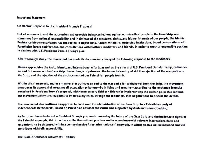 حماس نے ٹرمپ منصوبے پر ردعمل دیتے ہوئے مطالبہ کیا ہے کہ غزہ کے مستقبل اور فلسطینی عوام کے جائز حقوق کا فیصلہ ایک جامع فلسطینی قومی فریم ورک کے تحت ہونا چاہیے۔ اس فریم ورک میں تمام فلسطینی دھڑوں کی شمولیت لازمی قرار دی گئی ہے تاکہ کوئی فیصلہ یکطرفہ نہ ہو۔ تنظیم نے مزید کہا کہ غزہ سے متعلق تمام فیصلے بین الاقوامی قوانین اور اقوام متحدہ کی قراردادوں کے مطابق ہونے چاہئیں۔