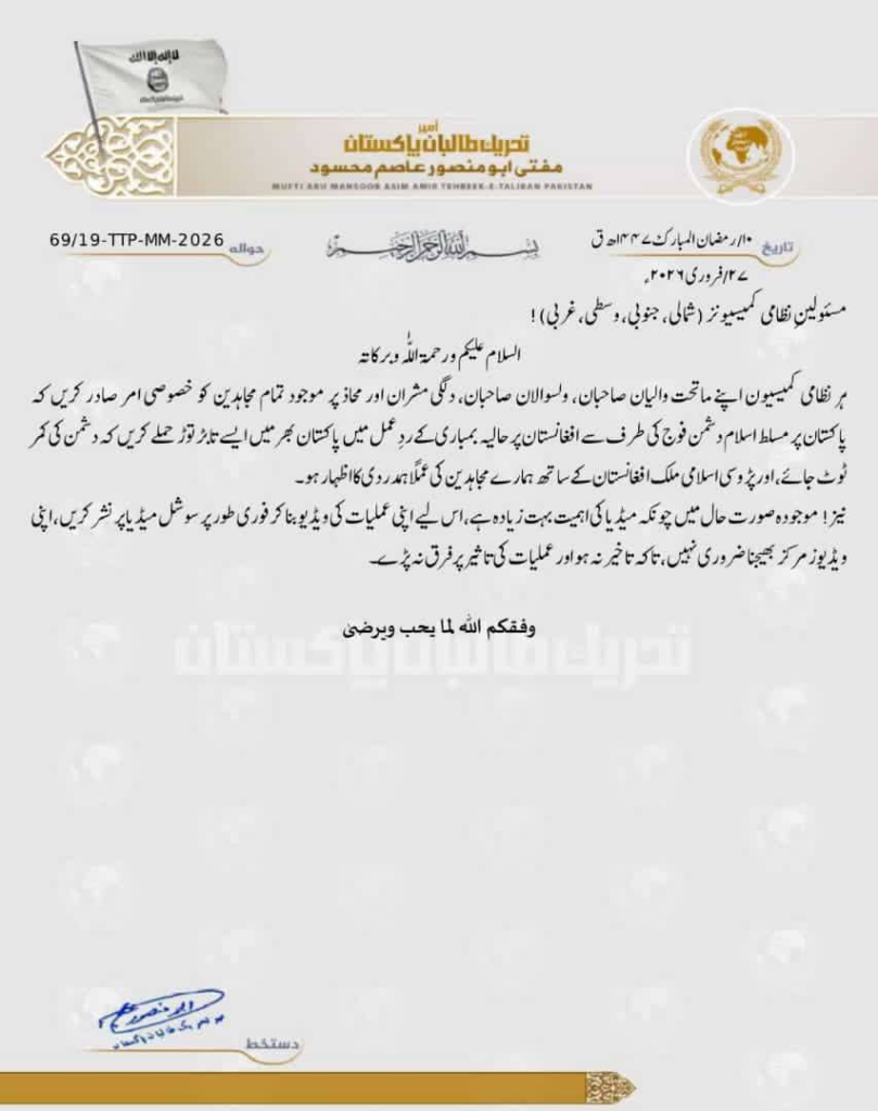 تحریکِ طالبان پاکستان (ٹی ٹی پی) کے سربراہ مفتی نور ولی محسود نے اپنے جنگجوؤں کو حکومتِ پاکستان کے خلاف باقاعدہ اور منظم آپریشنز شروع کرنے کی ہدایت جاری کر دی ہے۔ ذرائع کے مطابق یہ پیغام تنظیم کے میڈیا ونگ کے ذریعے مختلف کمانڈرز تک پہنچایا گیا، جس میں کارروائیوں میں شدت لانے پر زور دیا گیا ہے۔